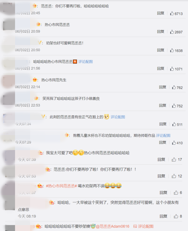 视频在网上流传后,网友留言,“ 劝架也好可爱啊范丞丞!”、“笑死我了哈哈哈哈这孩子打小就善良”、“此刻的范丞丞是有些正气在脸上的”、“热心市民范先生”等。