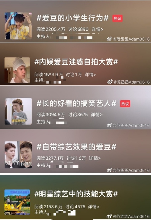 范丞丞昨晚(5日)突然在微博晒出几组沙雕热搜话题的截图,包括:爱豆的小学生行为、内娱爱豆迷惑自拍大赏、长得好看的搞笑艺人、自带综艺效果的爱豆、明星综艺中的技能大赏。