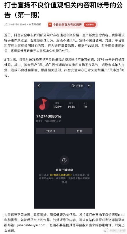 或许人红是非多,有人批评风小逸的举止太过做作恶心,还疑似将他举报至被封号。抖音账号也曾发声明表示:“风小逸因长期渲染卖惨和宣扬不良风气、诱导未成年人打赏,造成不良社会影响。根据相关规则,抖音安全中心已永久封禁用户账号。”有人猜测,除了声明中提及的诱导打赏外,太过娘炮可能也是风小逸遭封杀的原因之一。
