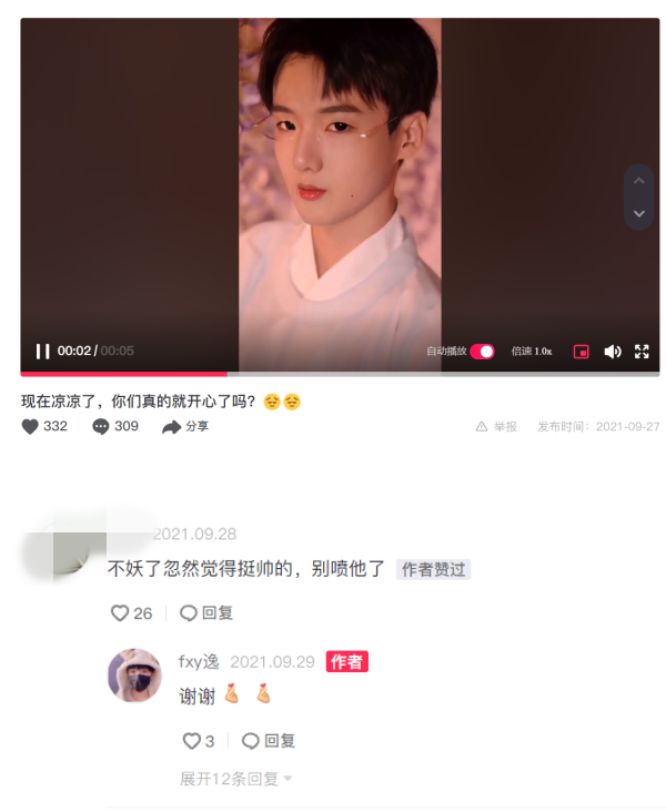 不过风小逸并无销声匿迹,而是改上传AI换脸的影片,网友抱两面看法:“不妖了忽然觉得挺帅的”、“打不死的小强”、“我一直都不认为你有自己的风格是一种错误,虽然有人不喜欢,但总有人喜欢的”、“这样正常多了,别再吃桃桃了”。