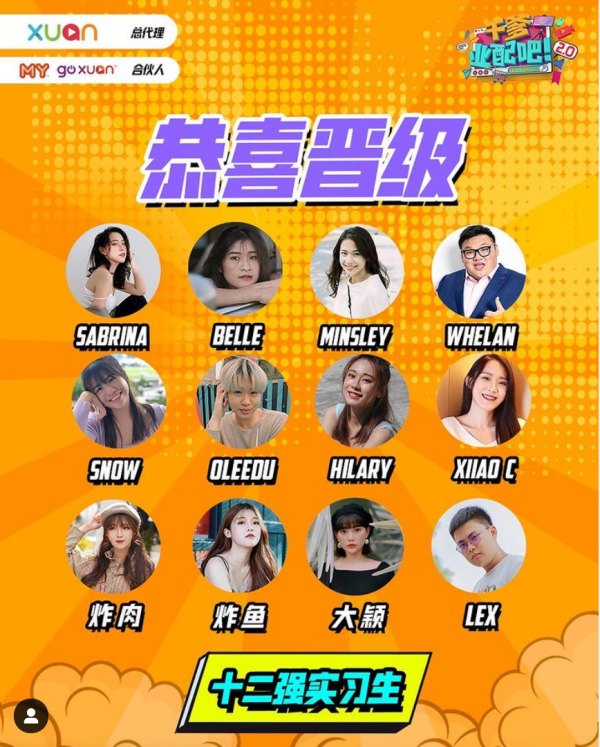 由XUAN作为总代理、原创网络选秀节目《干爹业配吧!》第二季十二强实习生已在7月份揭晓。除了早前表现优异、当场获得由幕后推手发出的“业配直通卡”的大颖、炸肉和Hilary以外,另外9位入围者包括了Sabrina、Belle、Minsley、Snow、Xiiao C、炸鱼、Whelan、Oleedu和Alex。