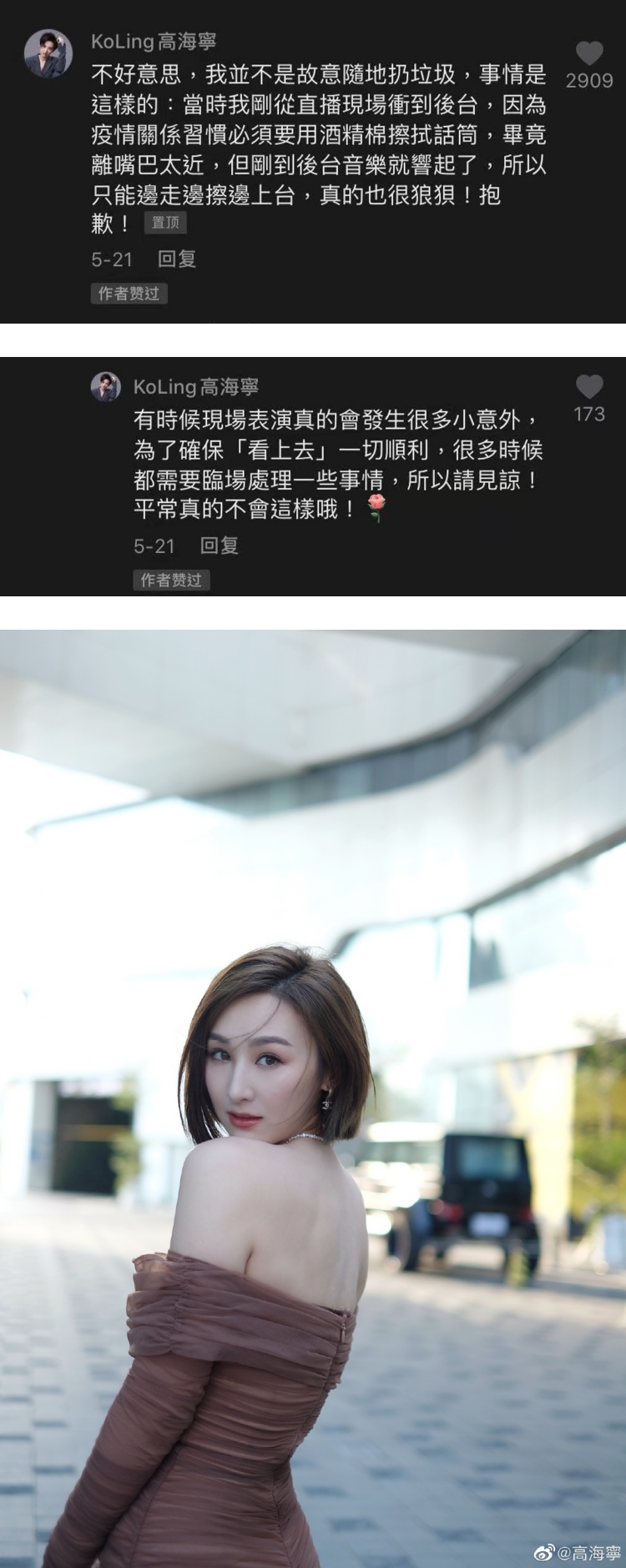 画面曝光后引来网友批评指责,高海宁其后留言道歉,并还原现场情况:“当时我刚从直播现场冲到后台,因为疫情关系习惯必须要用酒精棉擦拭话筒,毕竟离嘴巴太近,但刚到后台音乐就响起了,所以只能边走边擦边上台,真的也很狼狈!抱歉!”