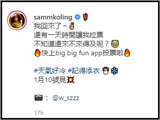 她昨天(8日)在IG晒出3张穿着细肩吊带低胸衣、躺在床上的性感美照,向粉丝喊话:“我回来了!还有一天时间让我拉票,不知道还来不来得及呢?”最后还不忘提醒:“天气好冷,记得添衣!1月10号见!”