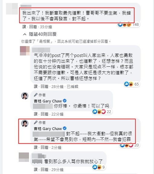 该名网友看到事情闹大,立刻道歉表示是自己断章取义,曹格则是继续回应“对不起,我太冲动,希望短期内不会见到你,不然我会犯罪”。