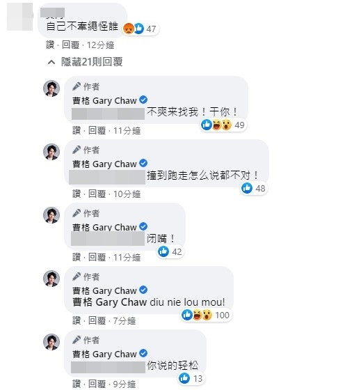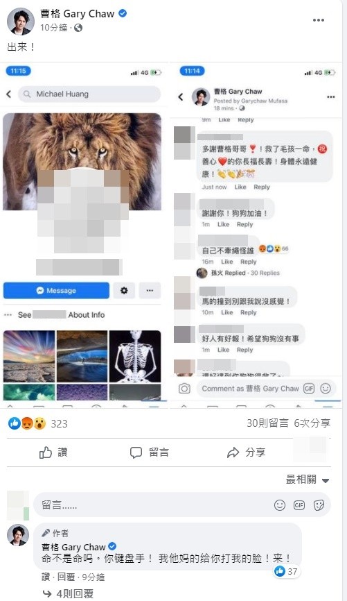 许多网民都称赞曹格的善心,但却有酸民留言一句“自己不牵绳怪谁”惹怒曹格,忍不住情绪失控截图回复该名网友“命不是命吗?你键盘手,我他X的给你打我的脸,出来!”