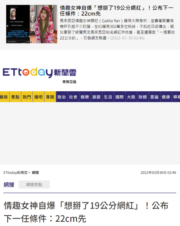 文中指出,Gatita和林尚进虽未正式承认恋情,但却时常分享2人暧昧照片,女方甚至大方承认林尚进不只有19CM,宽度还达4.7CM,但未明讲是什么部位,引人遐想。
