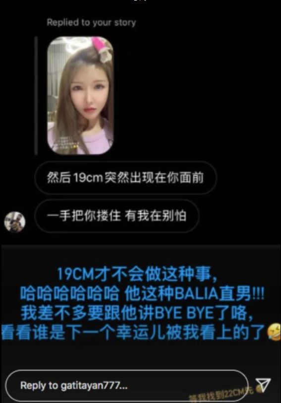 不料Gatita却回复“19cm才不会做这种事,哈哈哈哈哈,他这种BALIA直男,我差不多要跟他讲BYE BYE了啰,看看谁是下一个幸运儿被我看上的了。”还放话要找22CM的,被猜测感情出现裂痕。