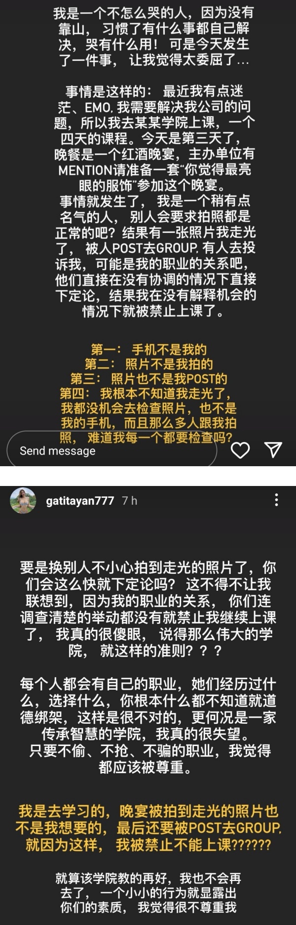 “他们在没有协调的情况下直接下定论,结果我在没有解释机会的情况下就被禁止上课了”、“要是换别人不小心拍到走光的照片了,你们会这么快就下定论吗?这不得不让我联想到,因为我的职业的关系”,炮轰学院没有调查清楚就禁止自己上课:“就算该学院教的再好,我也不会再去了,一个小小的行为就显露出你们的素质,我觉得很不尊重我。”