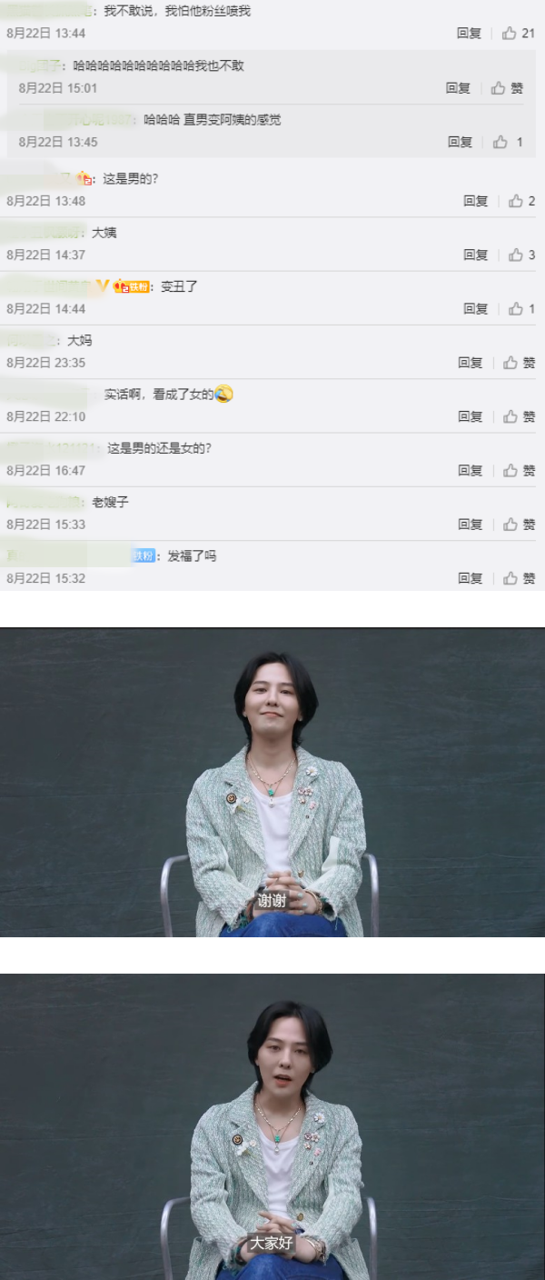 动图传回微博后,部分网友表示无法欣赏他的造型:“直男变阿姨的感觉”、“实话啊,看成了女的”、“这是男的还是女的?”、“发福了吗”、“这是男的?”等,还有人认为他和金高银有异曲同工之妙:“仿佛一个女..”。