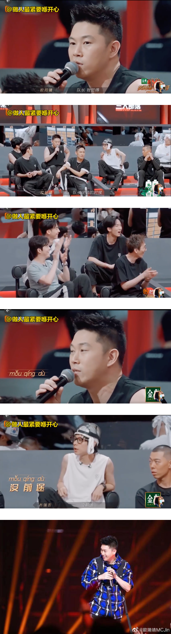 而欧阳靖在跟敖犬、布瑞吉、瑞奇、麦亨利等艺人组队并成为队长后发表了感言,他先提到:“一般来说,队长说话的时候都会站起来的,说真话,队长我觉得“冇sheng 度”,然后转头用粤语问了麦亨利“某程度”怎么说,遭到另一名团员布瑞吉误解成:“没前途”。原来欧阳靖最终要表达的正是:“某个程度”,一番操作笑翻全场!