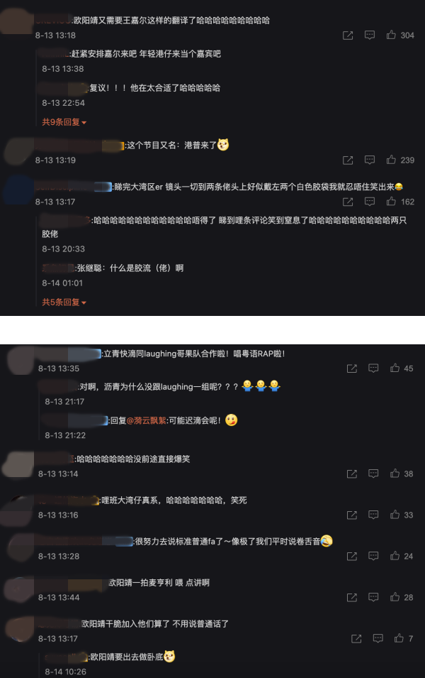 网友们纷纷留言:“节目又名:港普来了”、“欧阳靖又需要王嘉尔这样的翻译了”、“这班大湾仔真的,笑死了”、“很努力去学普通fa了,哈哈哈” 等。