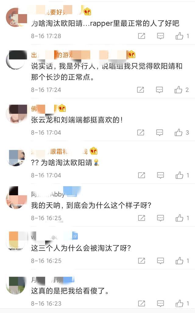 据悉,二公分数最少的一个队伍必须淘汰三个人,而以上三人的队伍排第四垫底,最后遭到淘汰。不少网友都被这消息吓到,毕竟欧阳靖是神级的Rapper,加上人气不输其他哥哥,怎么就被淘汰了。