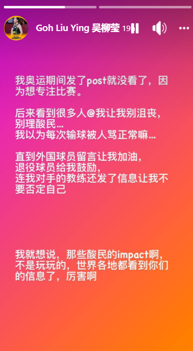 大马奥运羽球混双代表陈炳橓和吴柳莹在小组赛不敌香港、德国和中国队,结束了东京奥运赛事。事后,吴柳莹在IG Story透露自己收到了很多人的信息,特别是让她别被酸民影响的留言。