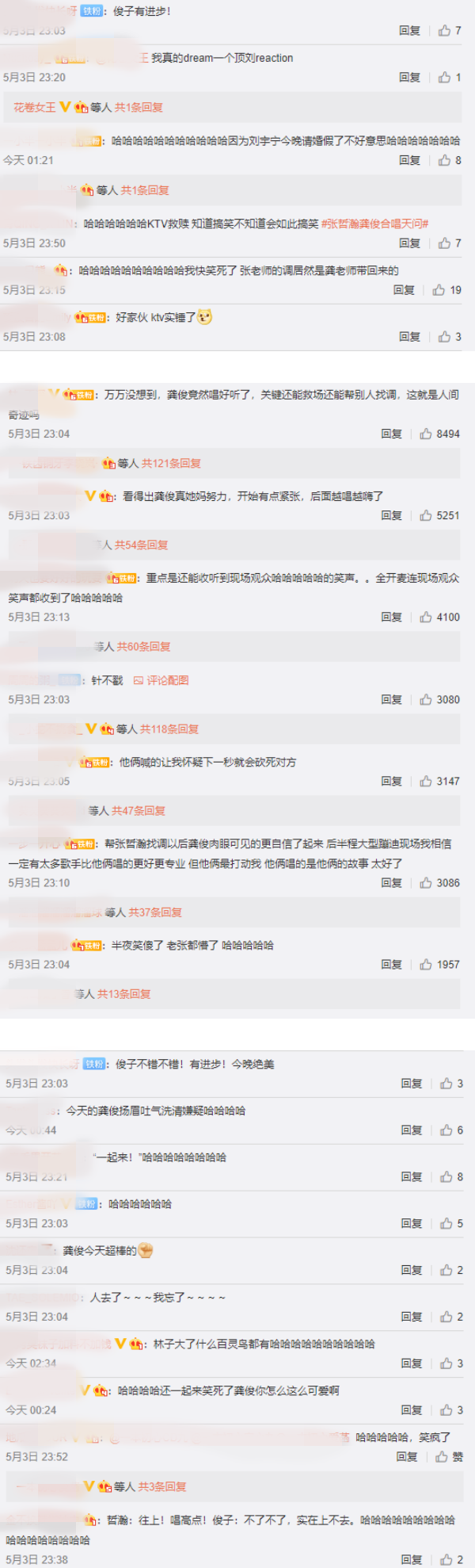 网友看了此片段,都笑得不行:“万万没想到,龚俊竟然唱好听了,关键还能救场还能帮别人找调,这就是人间奇迹吗”、“他俩喊的让我怀疑下一秒就会砍死对方”、“帮张哲瀚找调以后龚俊肉眼可见的更自信了起来”、“虽然难听 但是至少是真唱”、“没想到吧,是俊子帮张老师找到了调”、“最好笑的不是西蒙帮老婆找调,而是西蒙唱的脸红脖子粗的还能抽出空来请观众一起来互动”、“峡谷百灵鸟是真的,坚强!~”