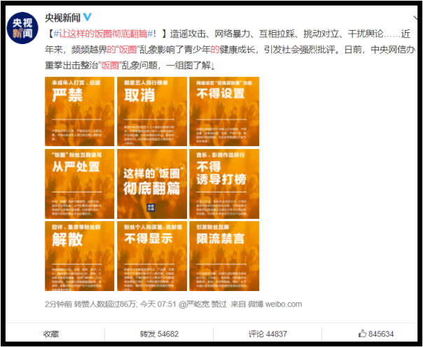 官媒带了话题“让这样的饭圈彻底翻篇”,强调:“造谣攻击、网络暴力、互相拉踩、挑动对立、干扰舆论......近年来,频频越界的“饭圈”乱象影响了青少年的健康成长,引发社会强烈批评。”于是,官方决定重拳出击整治“饭圈”乱象问题。