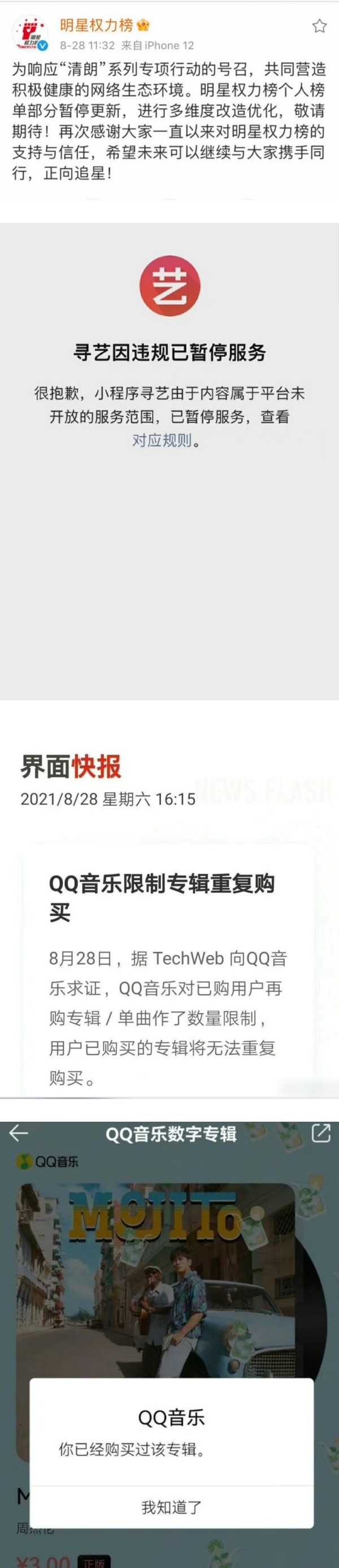 许多平台似乎都受清朗行动影响,被限制或暂停服务。像是微博的艺人超话排行榜排名目前已经被取消,知名音乐平台“QQ音乐”也被指出似乎不能购买已经买过的专辑,官方也承认的确进行了消费限制,粉丝们不需要再疯狂刷榜。另外,通过粉丝签到、提高艺人再整个网络权重影响力的“寻艺”小程序,显示因为违规暂停服务。