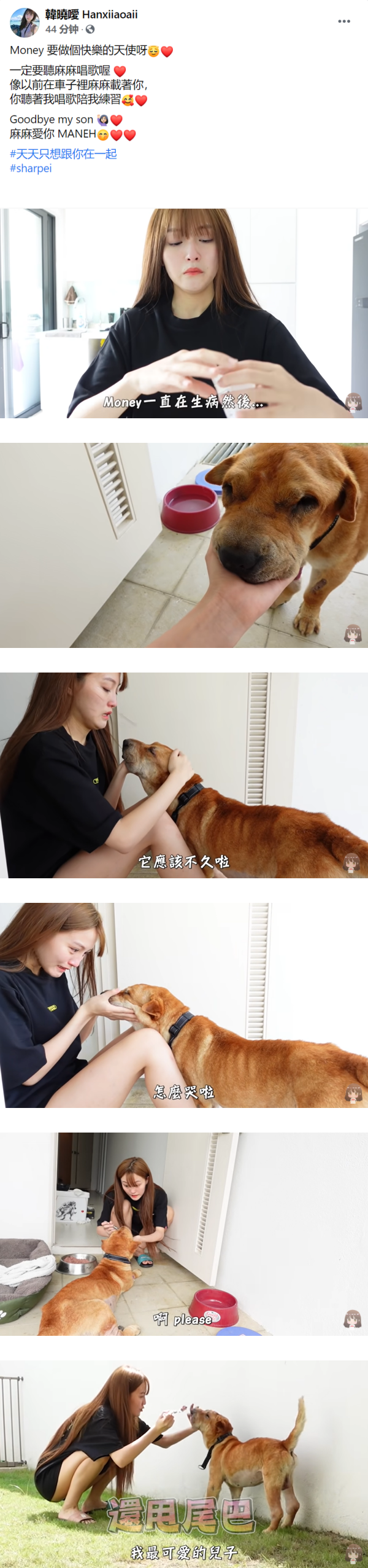 本地YouTuber韩晓嗳不时在社交媒体上分享自己的生活点滴,19日午间,她在Facebook上透露爱犬Money离世的消息。