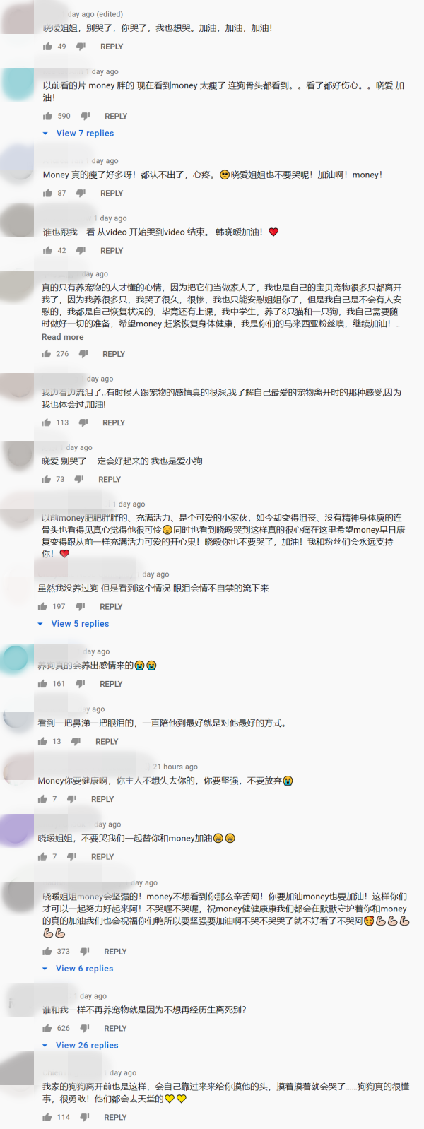 韩晓嗳和爱犬的互动视频曝光后,感动了许多网友,有者直呼从开始哭到结束,纷纷想起和家里毛小孩相处的点滴,“狗狗真的很懂事,很勇敢!他们都会去天堂的”、“谁也跟我一看 从video 开始哭到video 结束”、“真的只有养宠物的人才懂的心情,因为把它们当做家人了”、“看到一把鼻涕一把眼泪的”等。