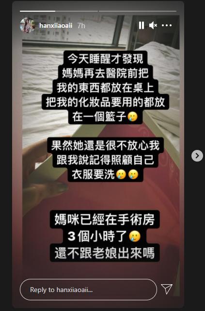 韩晓嗳上传自己流泪的自拍照,希望妈妈赶快好起来:“照顾人太累了,我照顾自己照顾到太累了。麻烦妈妈快点好起来,帮忙照顾一下我。”她早前也透露,妈妈在生日当天进行了复诊,需再动手术的消息也是当时才知道的。
