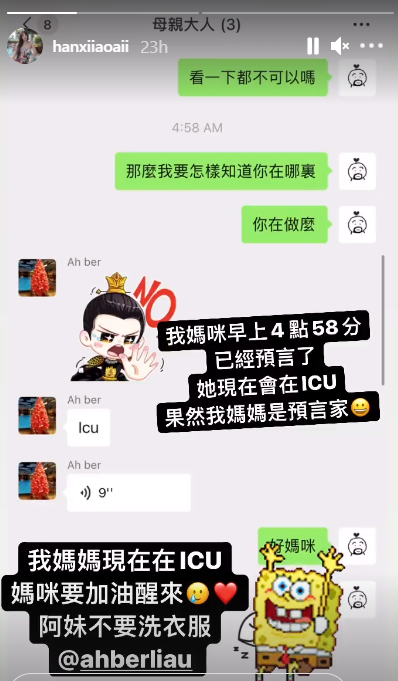 据悉,韩晓嗳妈妈24日进行了第二次脑部手术,目前人在加护病房:“看着妈妈在加护病房,我就一直哭哭哭哭,为什么那些仪器不是在我身上,而是在我妈妈呢?”、“我跟妈咪说拜拜的时候,我就狂哭;怕的人是我”。