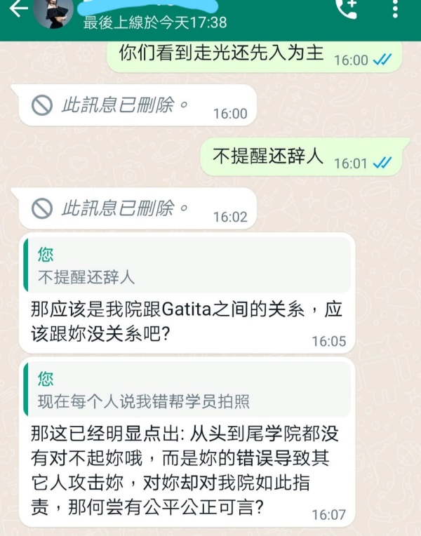 并且院方根本没有找我和尚进还有那位拍照男生了解情况,只是因为根本没在现场拍照的投诉者的投诉,就直接在晚上十一点多短讯尚进叫gattita 隔天不要来上课了。