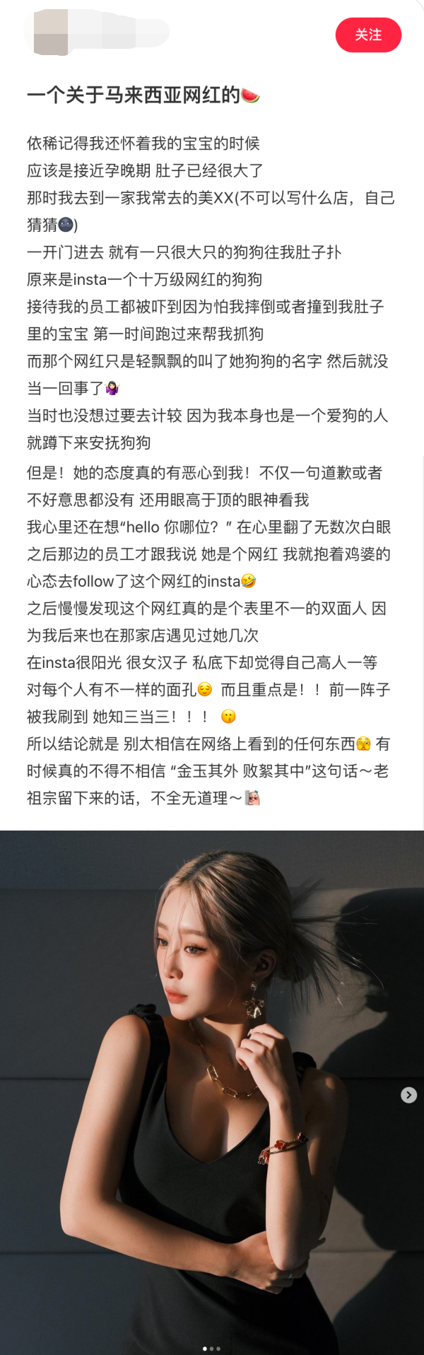 大马网红圈又有新瓜!近日一名00后美女网红Heyiamcoco 被曝出是双面人,狗狗差点扑倒孕妇后态度也非常恶劣,遭到该网友在小红书上发文控诉,本尊也直接火速留言道歉了!