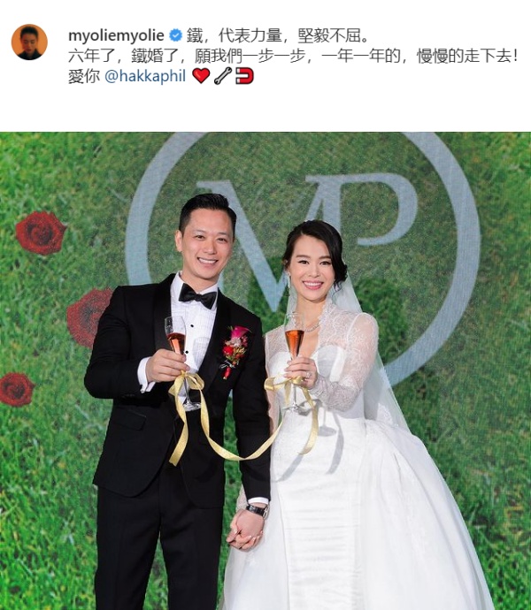 胡杏儿贴出一张在婚礼上,和老公牵手举杯的照片,她写下结婚6年,步入铁婚,希望未来能和老公一步步、一年年的走下去,文末她告白老公李乘德写下,“爱你”。