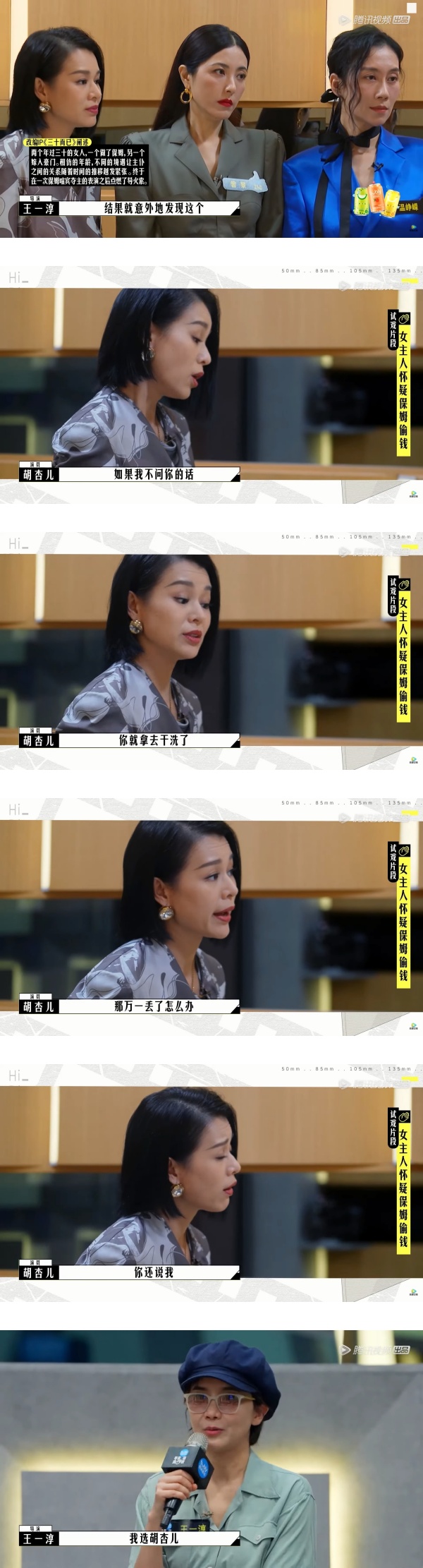 胡杏儿在节目中被欲邀请合作演员的导演王一淳要求试戏,对方安排一场《三十而已》故事,由胡杏儿饰演女主人,温峥嵘则饰演被误会偷钱的保姆。
