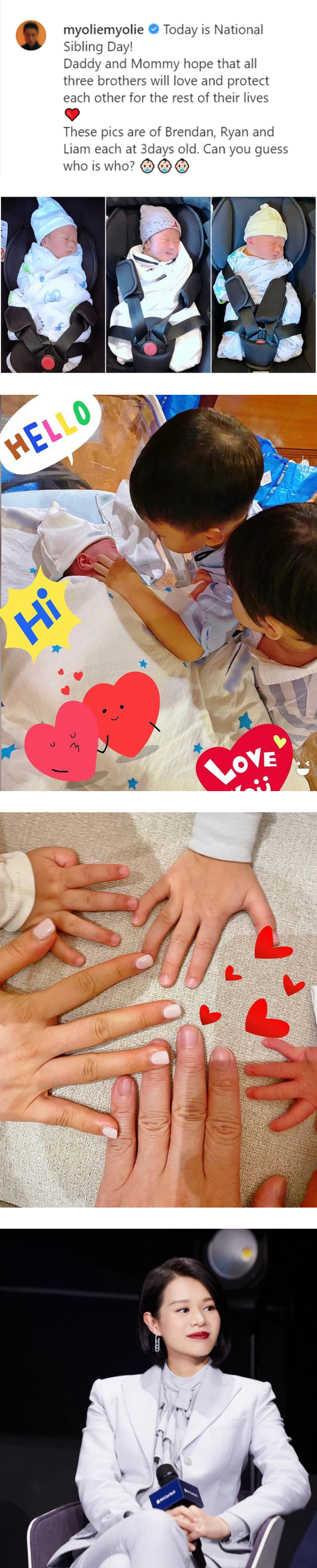 胡杏儿在贴文中提到这天是“兄弟姐妹日”,她和老公希望三位儿子都能相亲相爱。另外,胡杏儿也提到这系列照片都是三位儿子,在出生3天后所拍下的,同时也问网友是否能分辨出Brendan、Ryan和Liam?