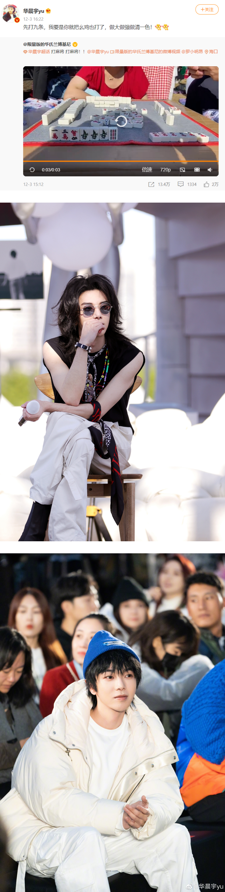 没想到这篇帖文真的钓出华晨宇本人,转发写道:“先打九条,我要是你,就把么鸡(一条)也打了,做大做强做清一色”,俏皮回应让不少粉丝笑疯:“你倒是下来打”、“一看就是高手”、“你敢这么打,也就我肯让你胡”。