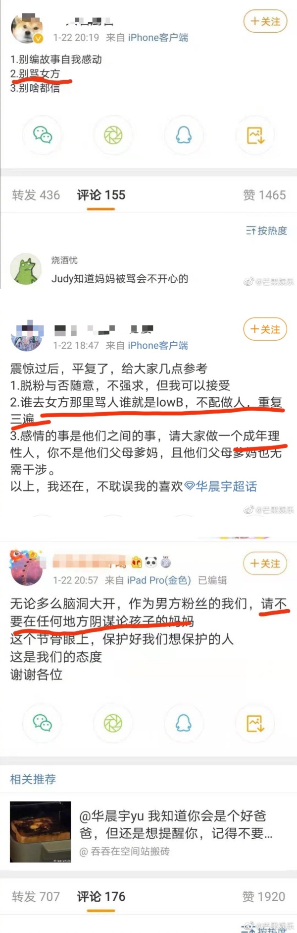 除了维护女方,粉丝们当然也为正主说话:“我年纪跟花(华晨宇)差不多,我就很开心他的担当”、“无需爱屋及乌,但请尊重每一个选择和结果”、“不骂不脱(粉)”、“接受不了就先放下手机,拥抱自己的生活。”