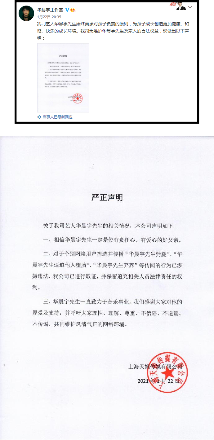 华晨宇工作室随后发声明,强调华晨宇秉承对孩子负责的原则,为孩子成长创造更加健康、和谐、快乐的成长环境,为维护华晨宇及家人的合法权益做出声明,否认“华晨宇劈腿”、“华晨宇逼迫他人堕胎”、“华晨宇弃养”等。