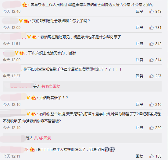 实际上,华晨宇早在当年参加《快乐男声》比赛时。就曾透露有抽烟的习惯,因此他在酒吧抽烟的画面曝光后,不少粉丝都表示,“30岁的人抽烟怎么了”、“人家没出道的时候就大大方说自己抽烟啦,这是什么稀奇事吗”、“是青年男女抽个烟真不是什么大错”、“我们都知道他会吸烟啊?怎么了吗?”