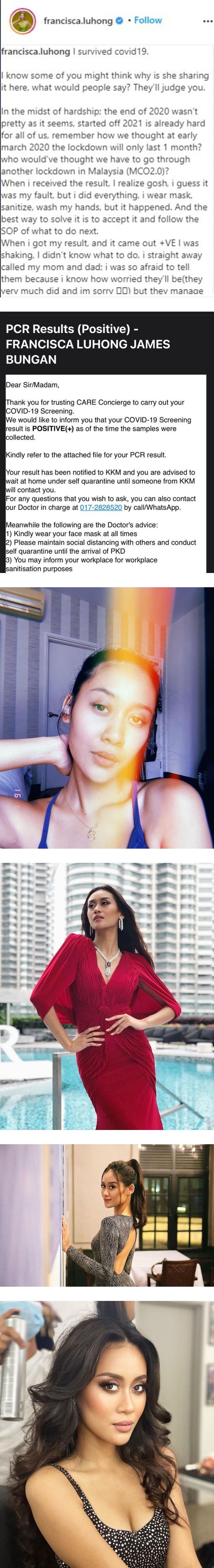 新冠肺炎疫情杀进大马娱乐圈,25岁的大马环球小姐Francisca Luhong James冠军,日前在Instagram上承认自己确诊新冠肺炎一事。