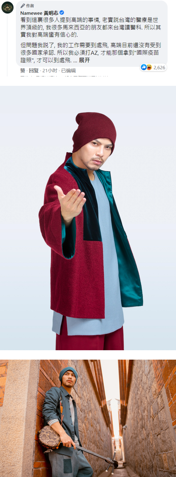 近年来都在台湾发展的大马歌手黄明志昨天(9日)发文,透露已经在台湾完成两剂AZ疫苗接种,没想到却被网友质疑他不打台湾生产的高端疫苗的原因,意外掀起争议。
