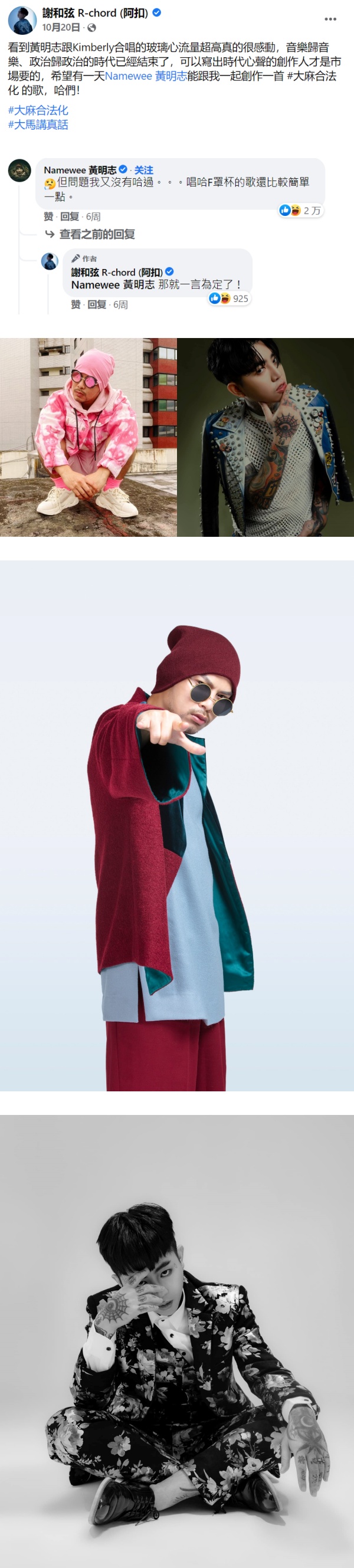 在10月底,谢和弦曾在FB发文赞黄明志和陈芳语的《玻璃心》很赞让他感动,文末他写下希望能和黄明志一起创作一首“大麻合法化”的歌曲。黄明志以直男式回应,“唱哈F罩杯的歌还比较简单一点”;没想到2个月后,两人真的合作上,让粉丝期待。