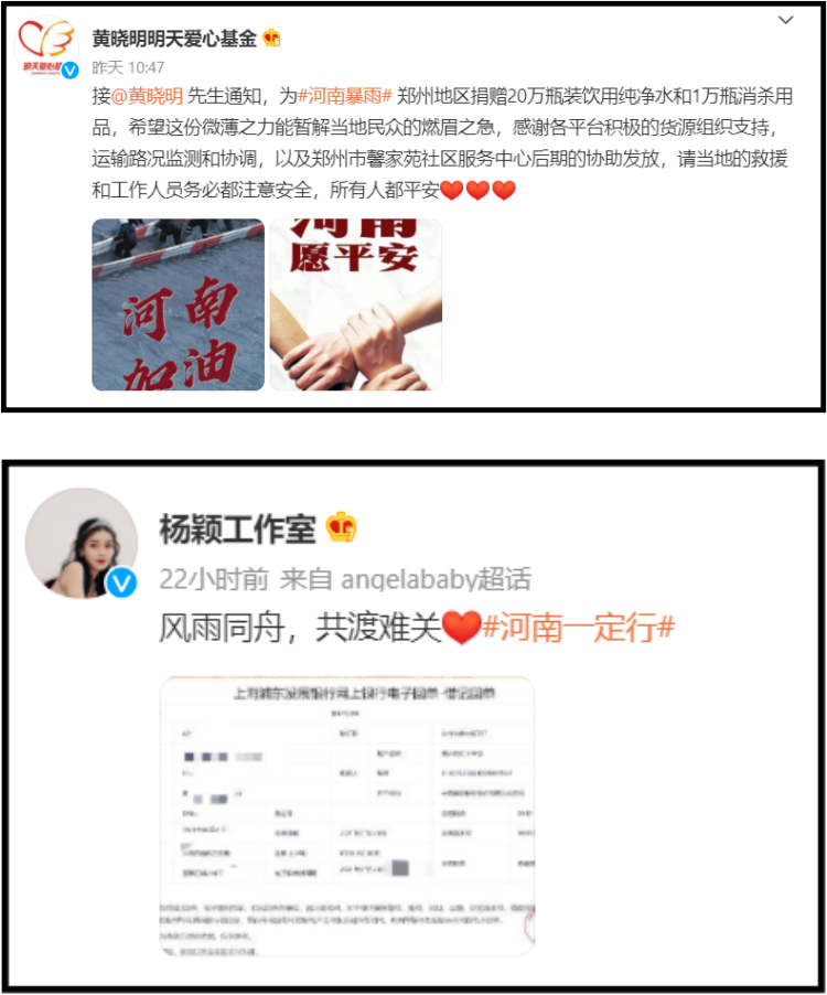 河南传出灾情后,许多艺人都捐款援助,其中邓超与孙俪、陈小春与应采儿、董子健与孙怡、杜海涛与沈梦辰、窦骁与何超莲、何猷君与奚梦瑶、李荣浩与杨丞琳、刘诗诗与吴奇隆、唐嫣与罗晋、张杰与谢娜、张若昀与唐艺昕、章子怡与汪峰等人都以夫妻或情侣的身份,合体进行捐款。