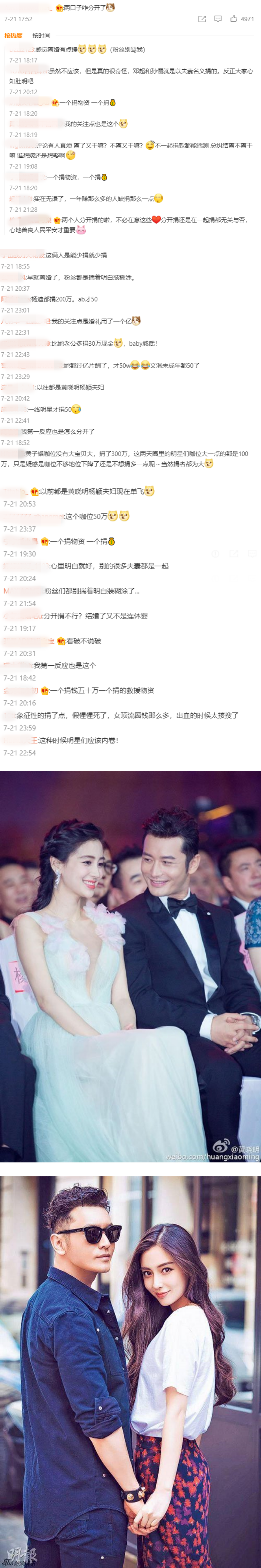 不过也有网友缓颊,认为:“一个捐物资,一个捐钱”、“分开捐不行?结婚了又不是连体婴”、“因为黄晓明是以他自己基金会的名义捐的啊,这也能联想”。