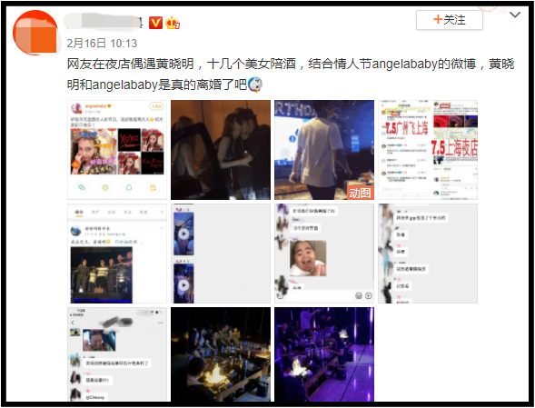 由于Angelababy曾在情人节当天发文:“自己是南方人不过西方的节日”,引起网友对两人婚变的揣测,因此黄晓明现身夜店的照片曝光后,让不少女方粉丝不满写道:“ab好惨”、“天天营销好老公,好爸爸结果天天找美女陪酒啊”、“黄先生长期以来立好老公人设其实背地里是个夜店咖,从谈恋爱到结婚生子,每一个时期都有被拍到出入夜店,试问一下谁能接受自己的老公和其他女人你侬我侬?”
