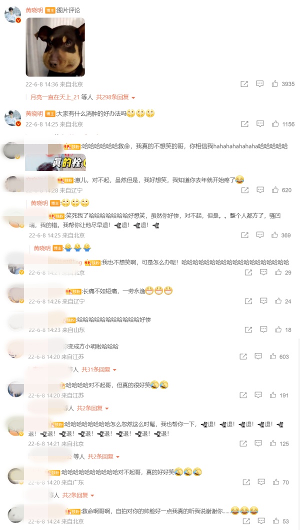 黄晓明在留言区向网友求助,“大家有什么消肿的好办法吗”,网友看了之后集体吐槽,“哈哈哈哈哈哈救命,我真的不想笑的哥”、“对不起,虽然但是,我好想笑,我知道你去年就开始疼了”、“虽然你好惨,对不起,但是。。整个人都方了”、“你变成方小明啦哈哈哈”等。