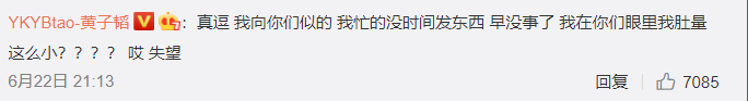 黄子韬随后在留言区回应:“真逗,我像你们似的,我忙的没时间发东西,早没事了,我在你们眼里我肚量这么小???? 哎 失望”。