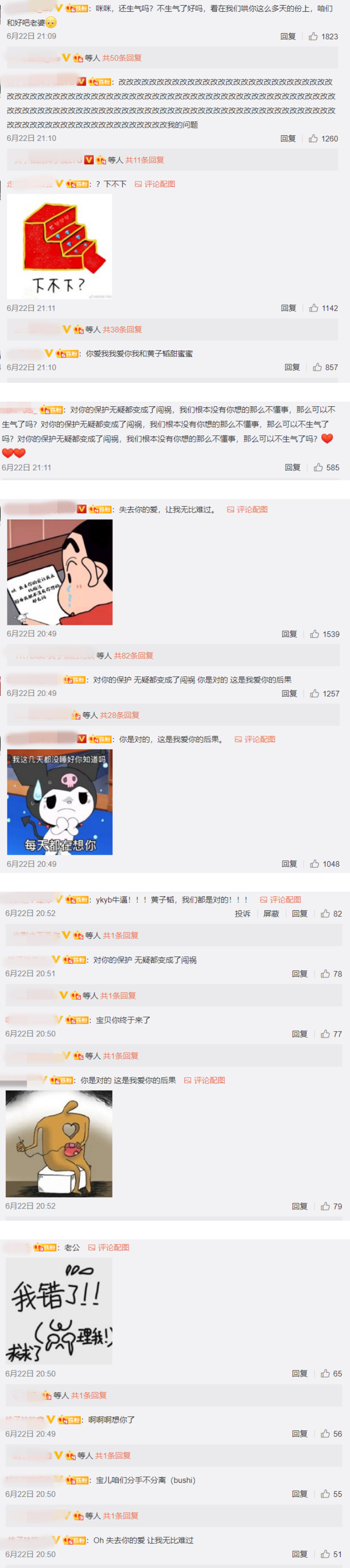 黄子韬昨天先是转发粉丝的一篇文章,大赞对方看到了细节,其后又为好友石玺彤的新歌打call,连发两篇文吸引了许多粉丝留言,为此前的风波道歉:“失去你的爱,让我无比难过”、“你是对的,这是我爱你的后果”、“咪咪,还生气吗?不生气了好吗,看在我们哄你这么多天的份上,咱们和好吧老婆”。