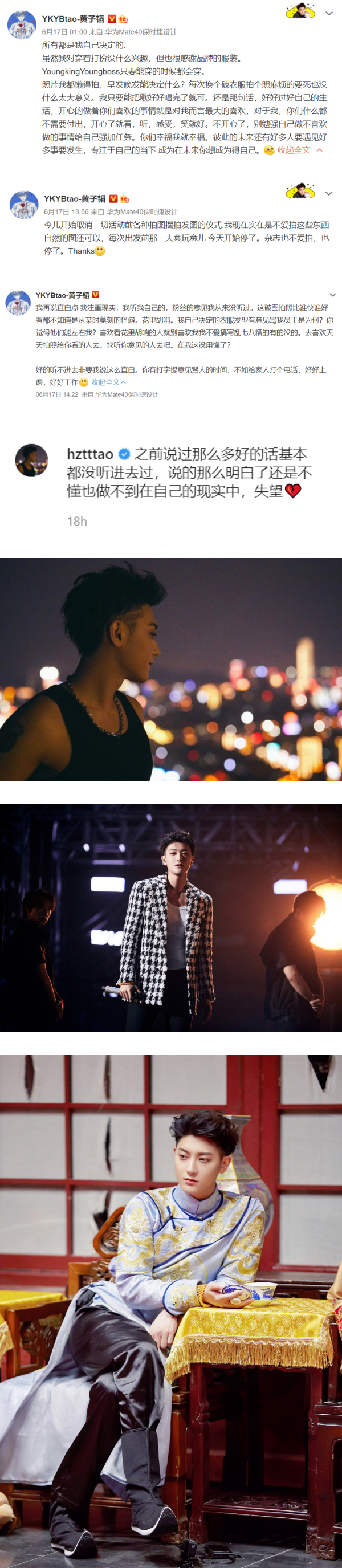 到了午间,黄子韬在微博喊话,从今开始将取消一切活动前的拍照、摆拍,他气说自己实在不爱拍这些东西!“今天开始停了。杂志也不爱拍,也停了。Thanks”;隔了一阵子,黄子韬再次发文,这次直接把矛头指向粉丝,“我再说直白点 我注重现实,我听我自己的,粉丝的意见我从来没听过。”对于外界一再指骂自己的员工,他实在看不过眼,黄子韬指要是网友喜欢看拍照,那请去看别人。