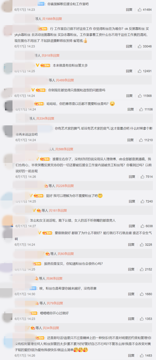 黄子韬在微博的贴文曝光后,粉丝留言分两派,有者力挺他的决定,有者质疑难道黄子韬不需要粉丝了?“你直接解散后援会和工作室吧”、“本来就是有些粉丝管太多”、“你的意思是以后都不需要粉丝是吗?”、“你有艺术家的脾气 却没有艺术家的底气”、“嗯嗯嗯你开心过就好”等。