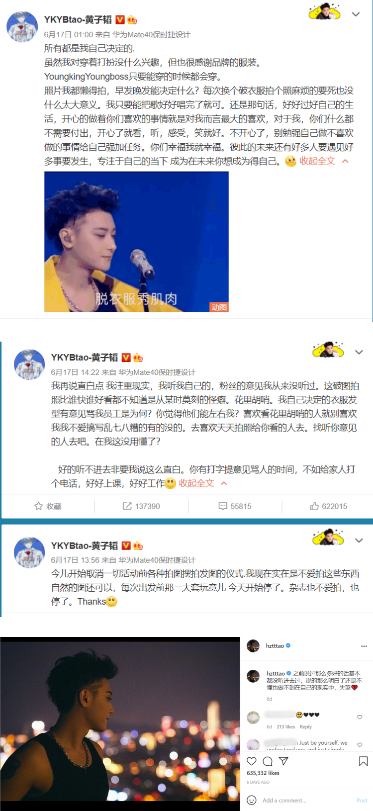 其实在事件一开始时,黄子韬维护工作人员的态度是让我挺欣赏的,并没有一昧地“媚粉”,也没有让工作人员背锅,而是承认所有的造型、摄影等都是自己决定的,并要求粉丝好好过自己的生活,而不是将希望寄托在虚妄的追星上,这些观点都是我非常赞同的。