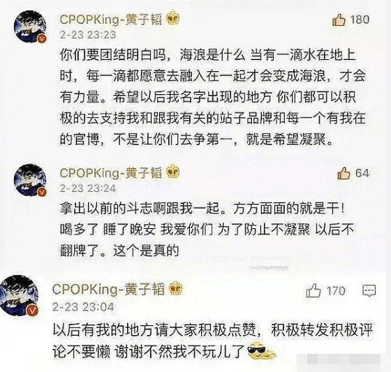 看看黄子韬的回应,再看回热评的粉丝留言:“对你的保护无疑都变成了闯祸,我们根本没有你想的那么不懂事”、“失去你的爱,让我无比难过”、“我错了,求求了,理我”等,虽然粉丝乐在其中,但在路人看来,真的非常卑微。