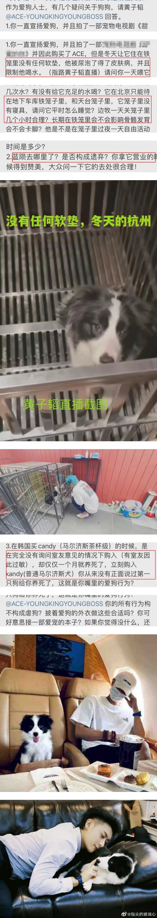 一名粉丝踢爆了黄子韬虐狗的7宗罪,除了直言黄子韬一直打着爱狗的旗号,背地里却做着虐狗的事情。这名粉丝提出几项证据,除了提到黄子韬在冬天时将爱犬ACE关在车库及天台的笼子里,笼子中没有任何保暖的东西,导致ACE被尿泡,得了皮肤病。