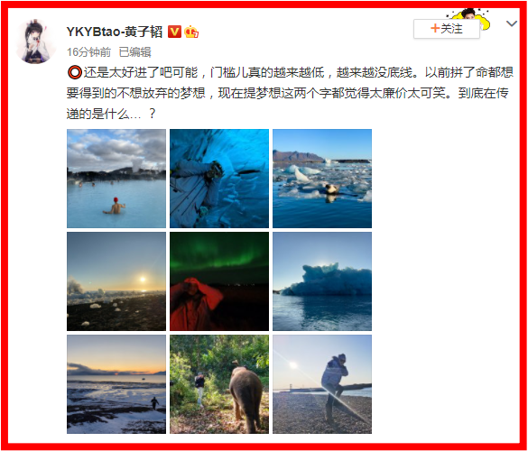 黄子韬今天在微博发文,怒轰:“⭕️(娱乐圈)还是太好进了吧可能,门槛儿真的越来越低,越来越没底线”,并感慨以前拼命想得到、不想放弃的梦想,如今却变了样,“现在提梦想这两个字都觉得太廉价太可笑。”