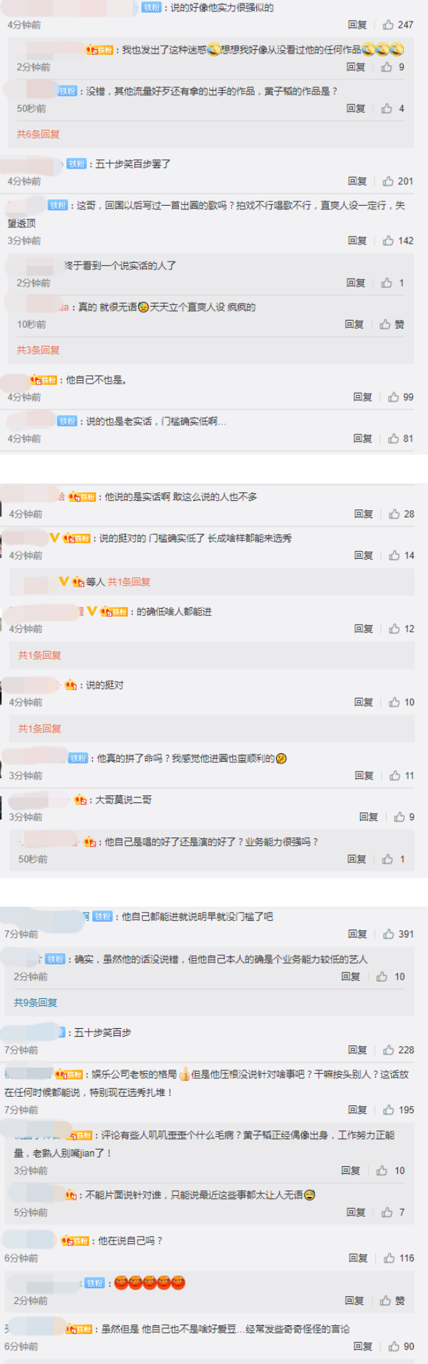 黄子韬的发文引来两极争议,有网友认为:“他自己这个偶像也没当明白吧”、“说的好像他实力很强似的”、“五十步笑百步罢了”、“他自己都能进,就说明早就没门槛了吧”。