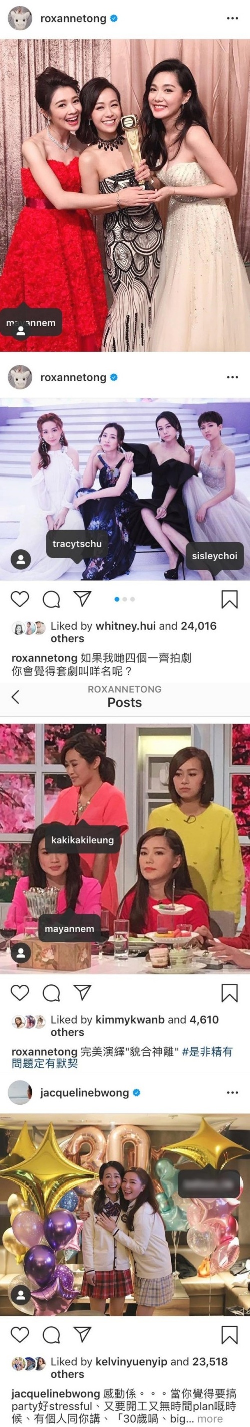 不仅如此,虽然汤洛雯、黄心颖都没有删除往日在IG晒出的合照,但汤洛雯当时曾在照片中tag黄心颖,如今也已取消tag。有网友怀疑,黄心颖封锁了汤洛雯的IG,才导致所有照片的tag都不见了。